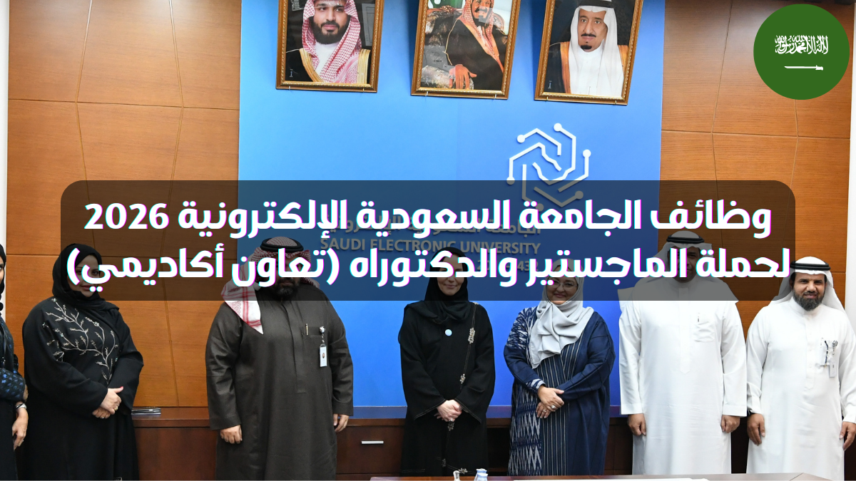 أعلنت الجامعة السعودية الإلكترونية عن توفر وظائف أكاديمية بنظام التعاون لحملة الماجستير والدكتوراه من السعوديين، للعمل في عدد من الكليات، تشمل تخصصات في العلوم والدراسات النظرية، والحوسبة والمعلوماتية، والعلوم الإدارية والمالية، والعلوم الصحية. ويبدأ التقديم عبر البوابة الإلكترونية اعتبارًا من 1 يناير 2026.